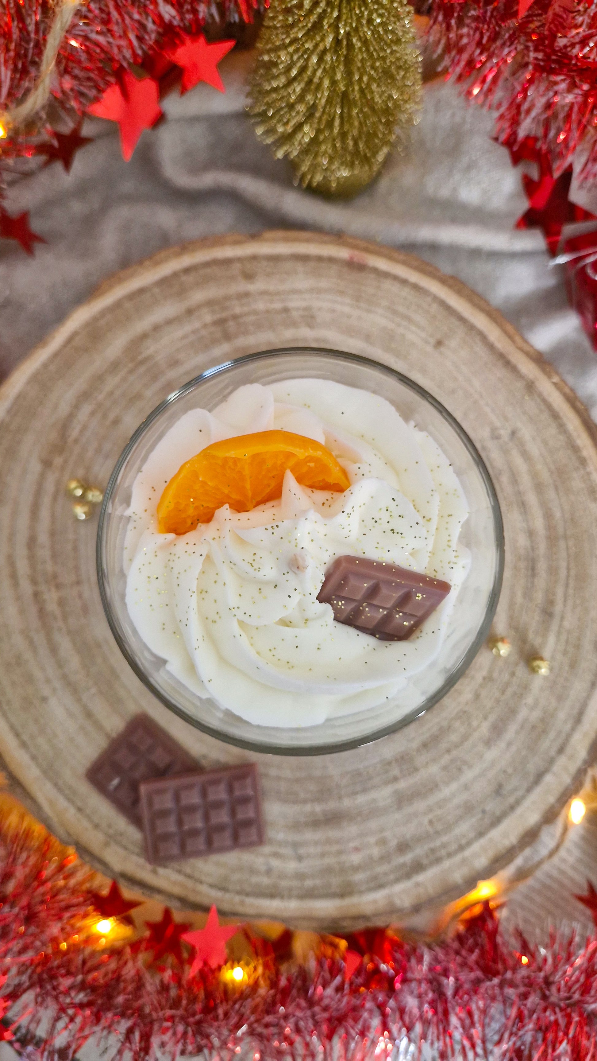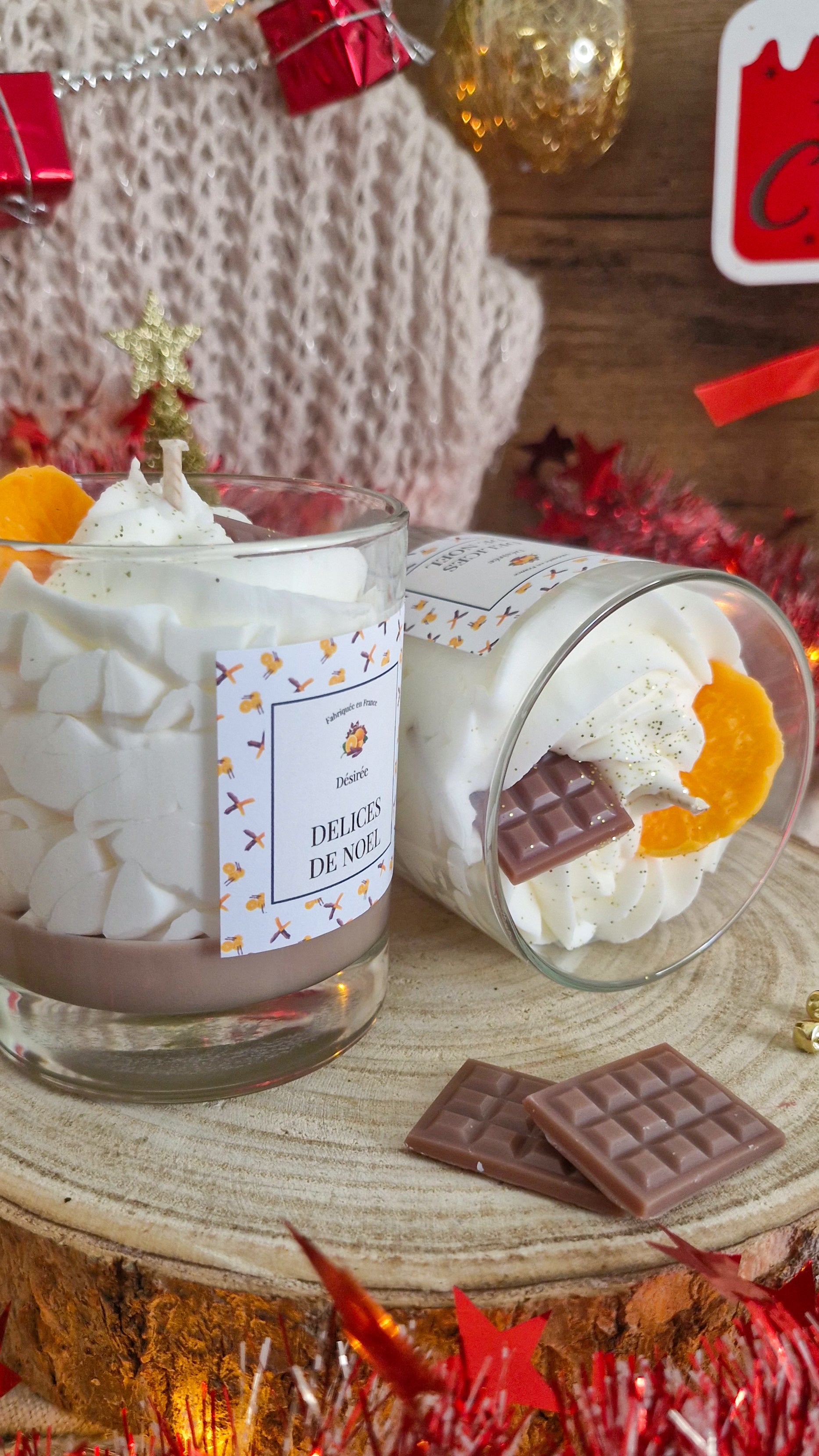 Succombez à la gourmandise avec Délices de Noël, une bougie chantilly au parfum fruité et chocolaté.